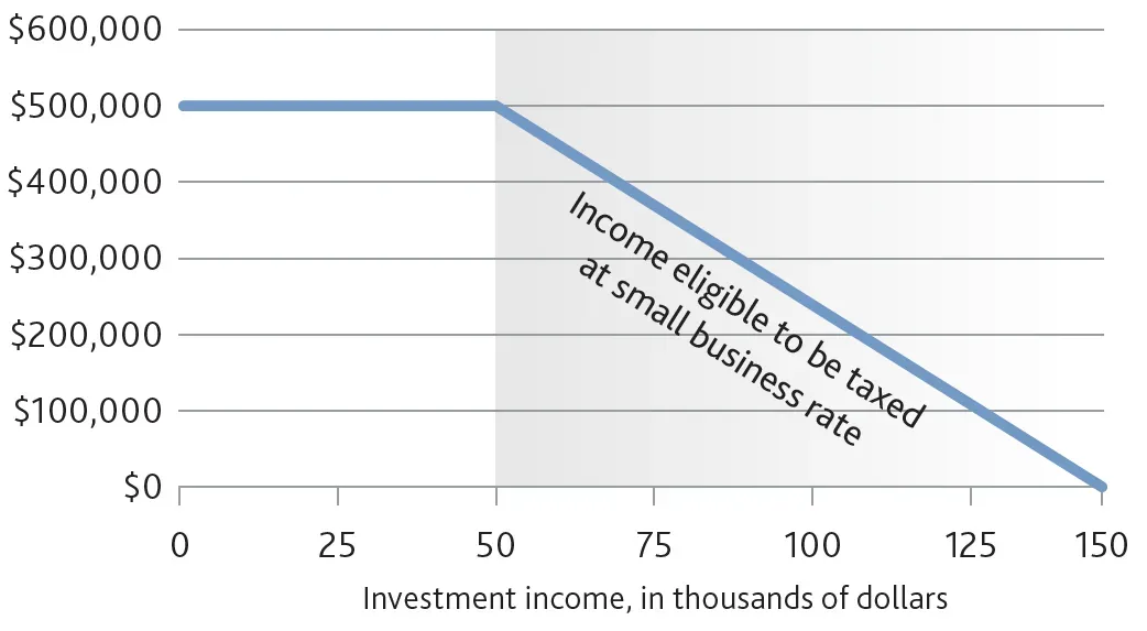In general, the income eligible to be taxed at the small business rate declines as your passive investment income grows, as shown in this chart: